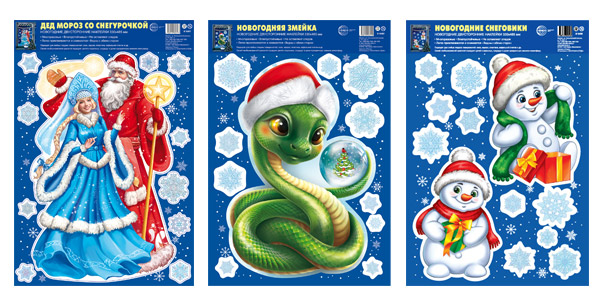 *КБН-17194 Комплект новогодних наклеек А3+. Новогодняя змейка-2 (3 наклейки, многоразовые, видны с обеих сторон)