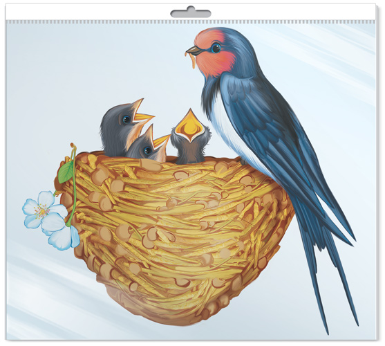 *ФМ-10473 ПЛАКАТ ВЫРУБНОЙ А4 В ПАКЕТЕ. Ласточка с птенцами (блестки, в индивидуальной упаковке, с европодвесом и клеевым клапаном)