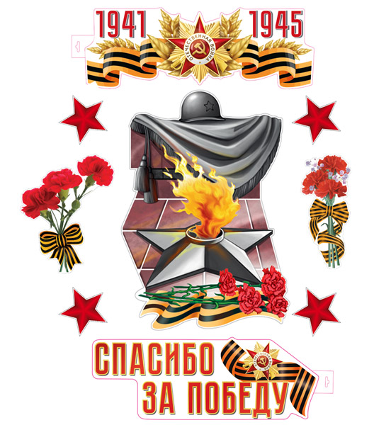 *КБ-17370 Комплект для оформления интерьера со скотчем. Спасибо за победу! (фигурный плакат А3, 2 фигурных плаката А4, 2 звезды по 2 шт., фигура гвоздики А4 по 2 шт., 5 фигур военных А3)