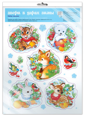НМТ1-14476 Новогодние наклейки на окна А4+. Звери в дарах зимы (уф-лак)