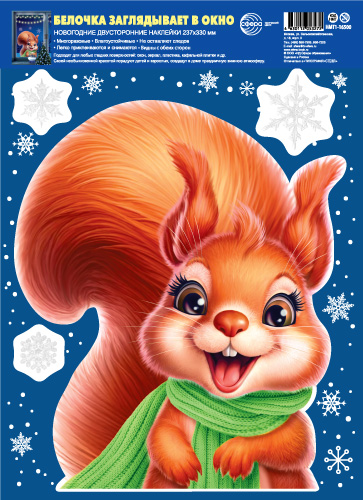 НМТ1-16500 Новогодние наклейки на окна А4+. Белочка заглядывает в окно (видны с обеих сторон, 4+4, снежинки из белил)