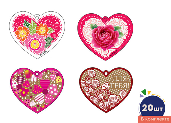 *КМ-17221 Комплект сердечек одинарных на скотче для украшения подарков (20 шт.: 4 вида по 5 шт.)
