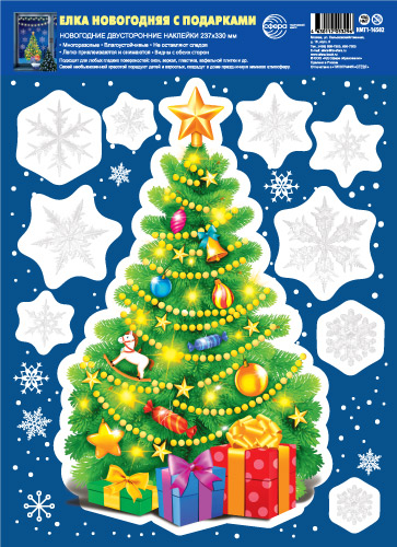 НМТ1-16502 Новогодние наклейки на окна А4+. Елка новогодняя с подарками (видны с обеих сторон, 4+4, снежинки из белил)