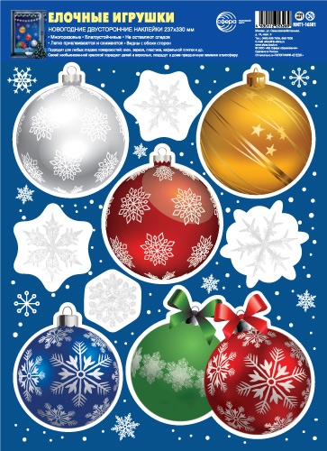 НМТ1-16501 Новогодние наклейки на окна А4+. Елочные игрушки, снежинки (видны с обеих сторон, 4+4, снежинки из белил)