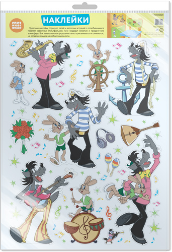 *КБН2-13371 Комплект декоративных наклеек формата А3. Герои из мультфильмов Бременские музыканты и Ну, погоди! (УФ-лак)