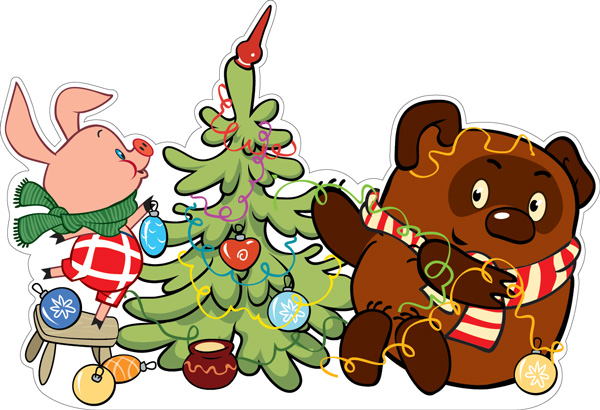 Ф2-12183 Плакат вырубной А3. Пятачок и Винни-Пух украшают елку из мультфильма Винни-Пух (с блестками в лаке)