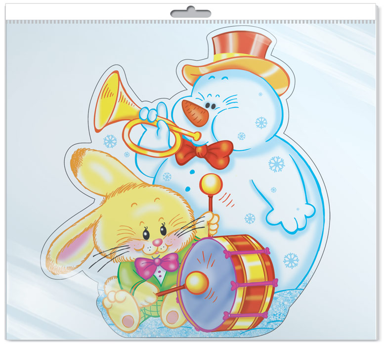 *ФМ-14459 ПЛАКАТ ВЫРУБНОЙ А4 В ПАКЕТЕ. Зайчик с барабаном и снеговиком (УФ-лак, в индивидуальной упаковке, с европодвесом и клеевым клапаном)
