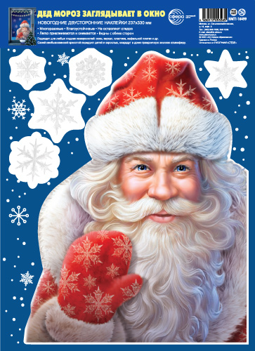 НМТ1-16499 Новогодние наклейки на окна А4+. Дед Мороз заглядывает в окно (видны с обеих сторон, 4+4, снежинки из белил)