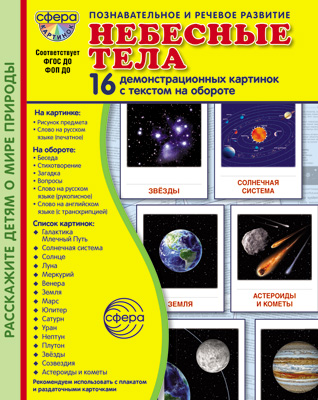 Дем. картинки СУПЕР Небесные тела. 16 демонстрационных картинок с текстом на обороте (учебно-методическое пособие с комплектом демонстрационного материала 173х220 мм, познавательное и речевое развитие)