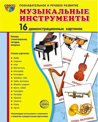 Дем. картинки СУПЕР Музыкальные инструменты. 16 демонстрационных картинок с текстом на обороте (учебно-методическое пособие с комплектом демонстрационного материала 173х220 мм, познавательное и речевое развитие)