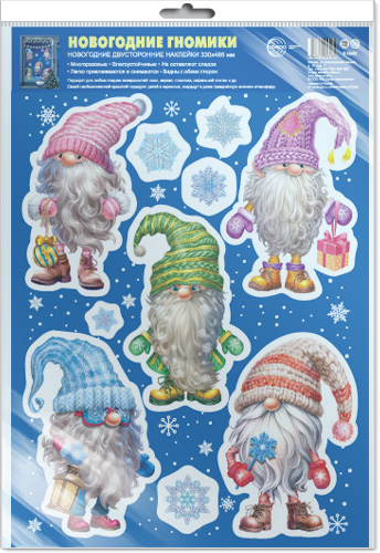 НМТ1-16503 Новогодние наклейки на окна А4+. Гномики новогодние (видны с обеих сторон, 4+4, снежинки из белил)