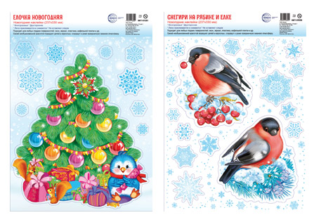 *КБН-17182 Комплект наклеек на окна А4+. Снегири с елочкой (2 наклейки, многоразовые, видны с обеих сторон)