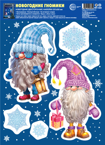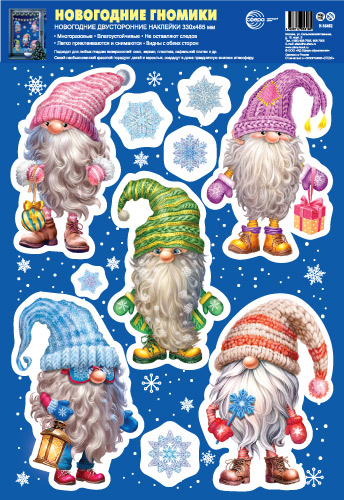 НМТ1-16503 Новогодние наклейки на окна А4+. Гномики новогодние (видны с обеих сторон, 4+4, снежинки из белил)