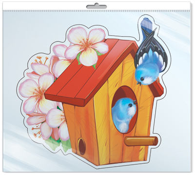 *ФМ-11389 ПЛАКАТ ВЫРУБНОЙ А4 В ПАКЕТЕ. Скворечник с птичками (блестки, в индивидуальной упаковке, с европодвесом и клеевым клапаном)