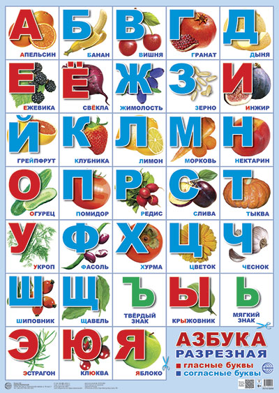 ПЛ-15684 Плакат А2. Азбука разрезная тематическая (с картинками фруктов и овощей, в голубой рамке)