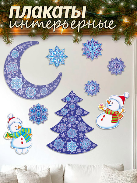 КБН-11986 Снежная фантазия. Новогодний комплект для оформления интерьера: 10 вырубных фигур: дерево А2; Елка и Месяц А3; 2 Снеговика А4; 5 снежинок (С блестками в индивидуальной упаковке с европодвесом и клеевым клапаном)