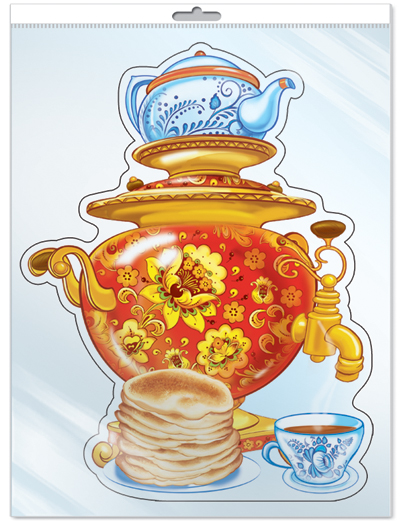 *ФМ-11173 ПЛАКАТ ВЫРУБНОЙ А4 В ПАКЕТЕ. Самовар с блинами (блестки, в индивидуальной упаковке, с европодвесом и клеевым клапаном)