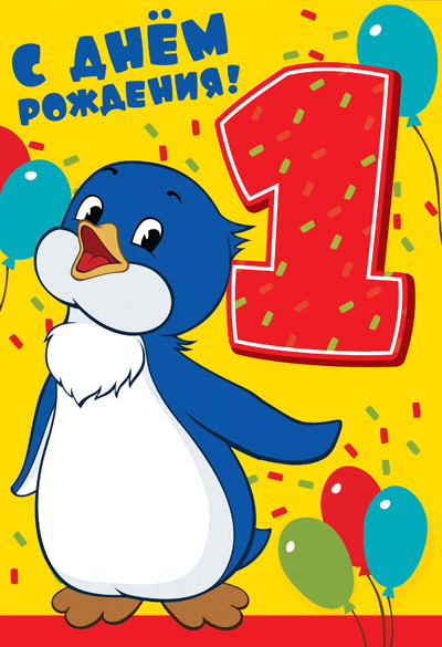 ЛН-12219 Открытки среднего формата. С Днем Рождения 1 годик (из мультфильма Приключения пингвиненка Лоло) (УФ-лак)