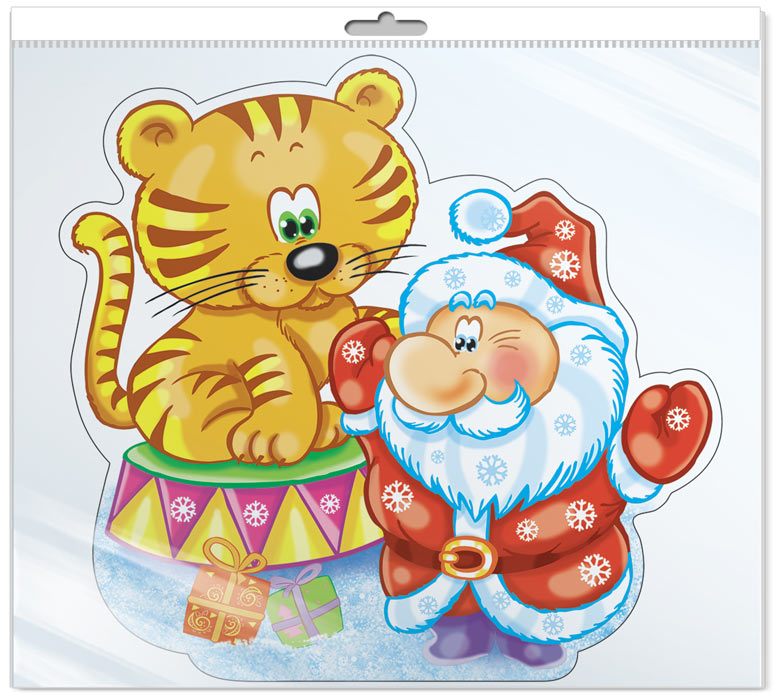 *ФМ-13782 ПЛАКАТ ВЫРУБНОЙ А4 В ПАКЕТЕ .Тигренок и дед мороз (блестки в лаке, в индивидуальной упаковке, с европодвесом и клеевым клапаном)