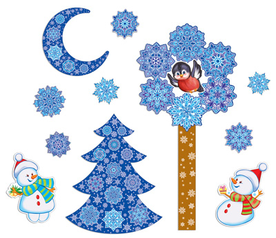 КБН-11986 Снежная фантазия. Новогодний комплект для оформления интерьера: 10 вырубных фигур: дерево А2; Елка и Месяц А3; 2 Снеговика А4; 5 снежинок (С блестками в индивидуальной упаковке с европодвесом и клеевым клапаном)