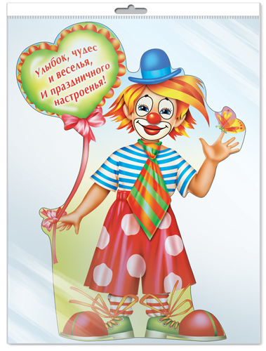 *Ф-6720 ПЛАКАТ ВЫРУБНОЙ А3 В ПАКЕТЕ. Клоун с шариком (блестки, УФ-лак, в индивидуальной упаковке, с европодвесом и клеевым клапаном)