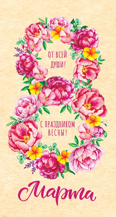 ЦВ-14414 Открытка евроформата. 8 марта.От всей души! С праздником весны! (выборочный УФ-лак, текст)
