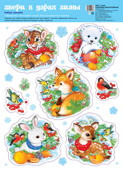 НМТ1-14476 Новогодние наклейки на окна А4+. Звери в дарах зимы (уф-лак)