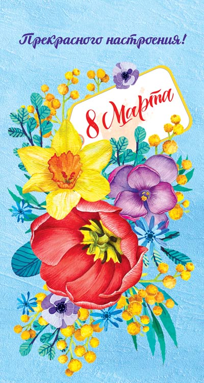 ЦВ-14416 Открытка евроформата. Прекрасного настроения 8 марта! Выборочный УФ-лак (текст)