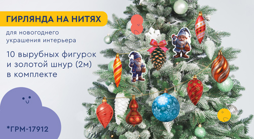 *ГРМ-17903 Гирлянда на нитях. Гномы наряжают елку (10 фигурок + золотой шнур 2 м)