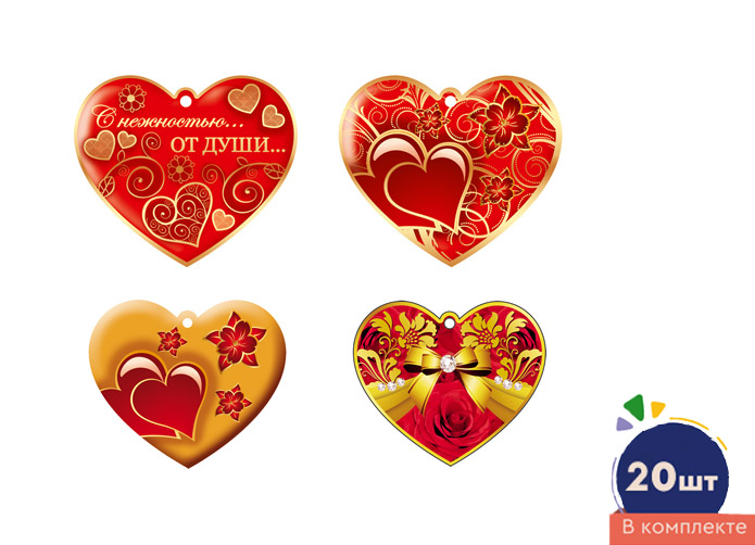 *КМ-17221 Комплект сердечек одинарных на скотче для украшения подарков (20 шт.: 4 вида по 5 шт.)
