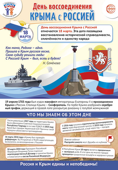 ПЛ-15765 Плакат А3. Праздничные даты по ФОП: 18 марта - День воссоединения Крыма с Россией