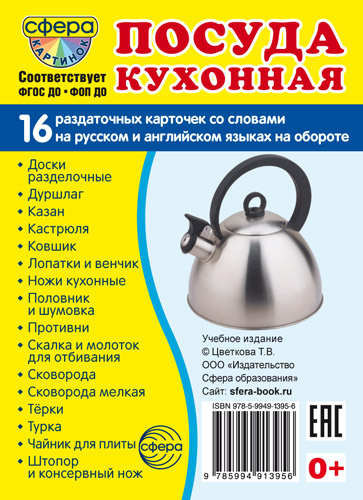 Дем. картинки СУПЕР Посуда кухонная.16 раздаточных карточек с текстом на обороте (учебно-методическое пособие с комплектом демонстрационного материала 63х87 мм, познавательное и речевое развитие)
