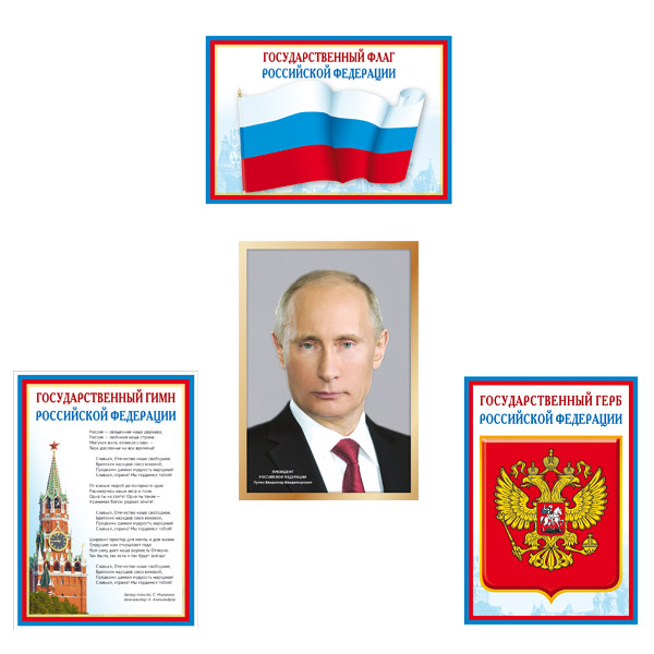 Комплект познавательных мини-плакатов. Российская символика: Флаг, Герб, Гимн, Президент (4 листа А4+, текст на обороте)