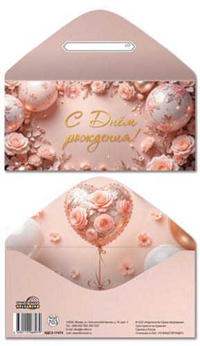 КДС2-17474 Конверт для денег на склейке. С Днем рождения! (женский, цветы, шарики, золотая фольга)
