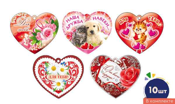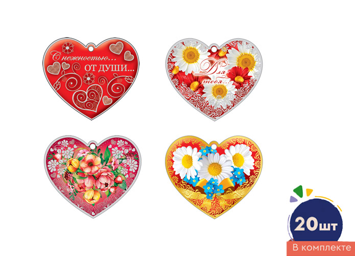*КМ-17221 Комплект сердечек одинарных на скотче для украшения подарков (20 шт.: 4 вида по 5 шт.)