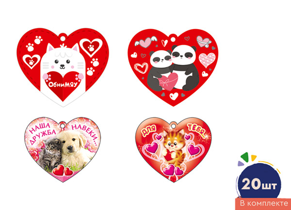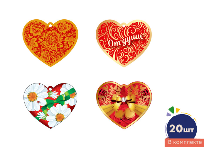 *КМ-17221 Комплект сердечек одинарных на скотче для украшения подарков (20 шт.: 4 вида по 5 шт.)
