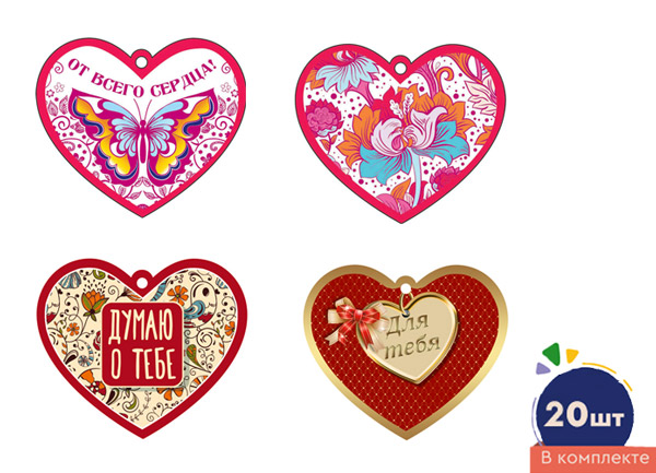 *КМ-17222 Комплект сердечек одинарных на скотче для украшения подарков (20 шт.: 4 вида по 5 шт.)