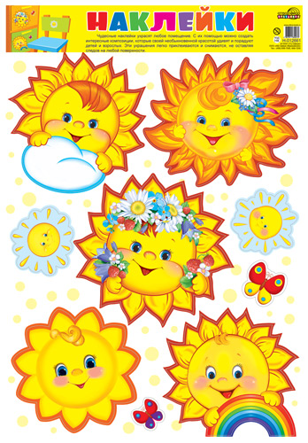 *Н-12661 НАКЛЕЙКИ А3+ В ПАКЕТЕ. Солнышки (в индивидуальной упаковке, с европодвесом и клеевым клапаном)