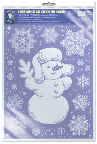 Н-16485 Новогодние наклейки А3+. Снеговик со снежинками (белила, многоразовые, видны с обеих сторон)