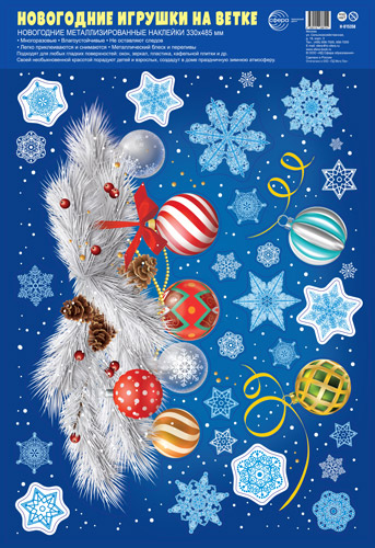 НМТ-15341 Новогодние наклейки на окна А4+. Шар на еловой ветке (cеребряная металлизация, многоразовые)