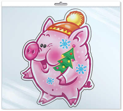 *ФМ-11431 ПЛАКАТ ВЫРУБНОЙ А4 В ПАКЕТЕ. Поросенок с елочкой (с блестками в индивидуальной упаковке с европодвесом и клеевым клапаном)